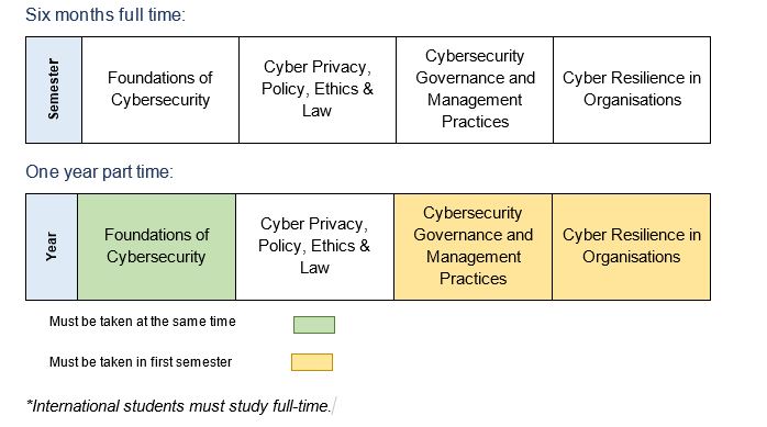 The Graduate Certificate in Cybersecurity (Management) is a six-month full time coursework program (24 credit points) aimed at students wanting a professional qualification to extend their existing knowledge base or upskill in cybersecurity. Students will develop a capability in analysing and designing cybersecurity management solutions for complex systems and organisations. The course is designed to meet the educational needs of students ultimately seeking to transition into or advance in a career as a cybersecurity professional.